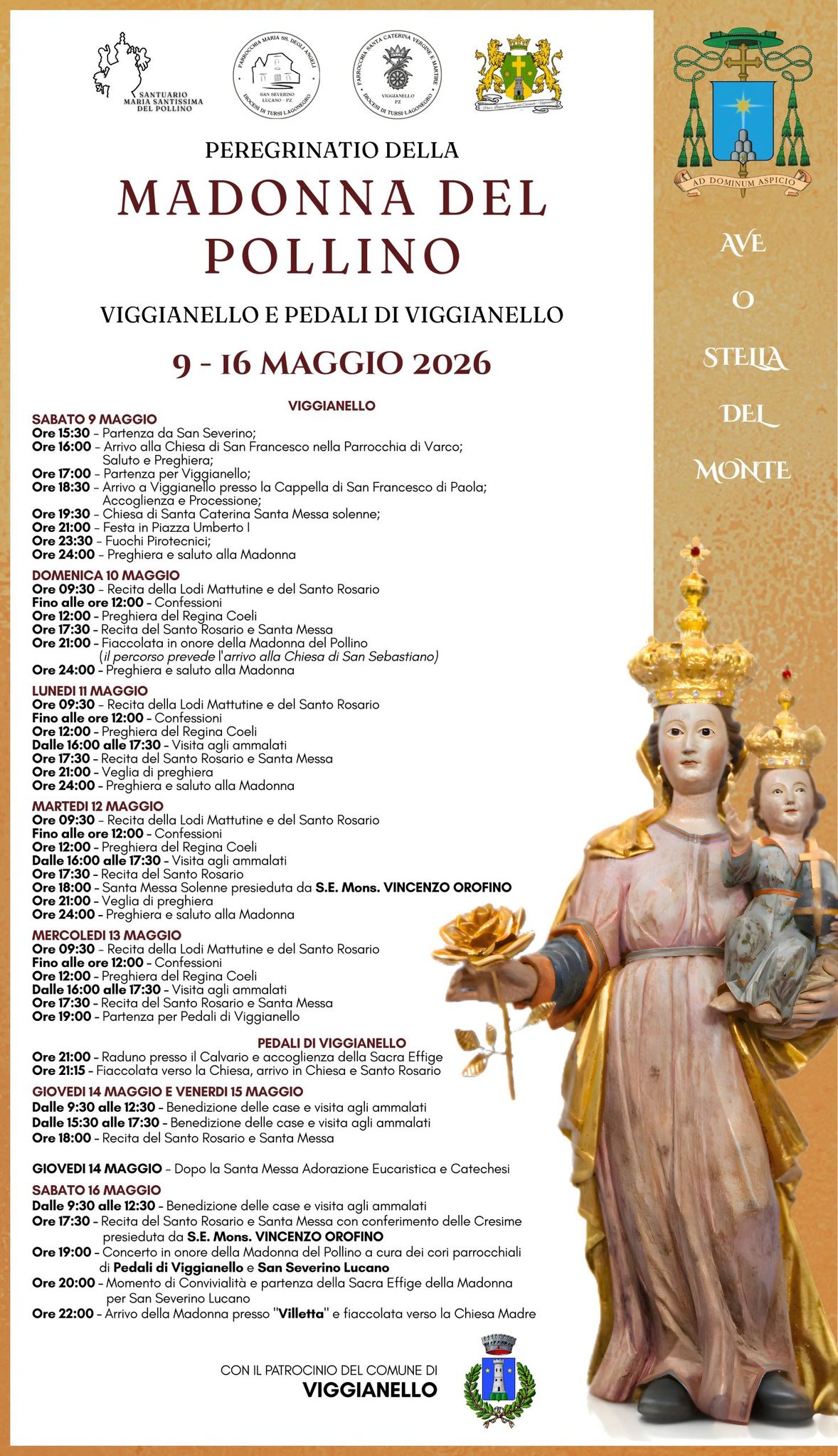 Di seguito il programma ufficiale della Peregrinatio della Madonna del Pollino a Viggianello e Pedali di Viggianello dal 9 al 16 maggio 2026………